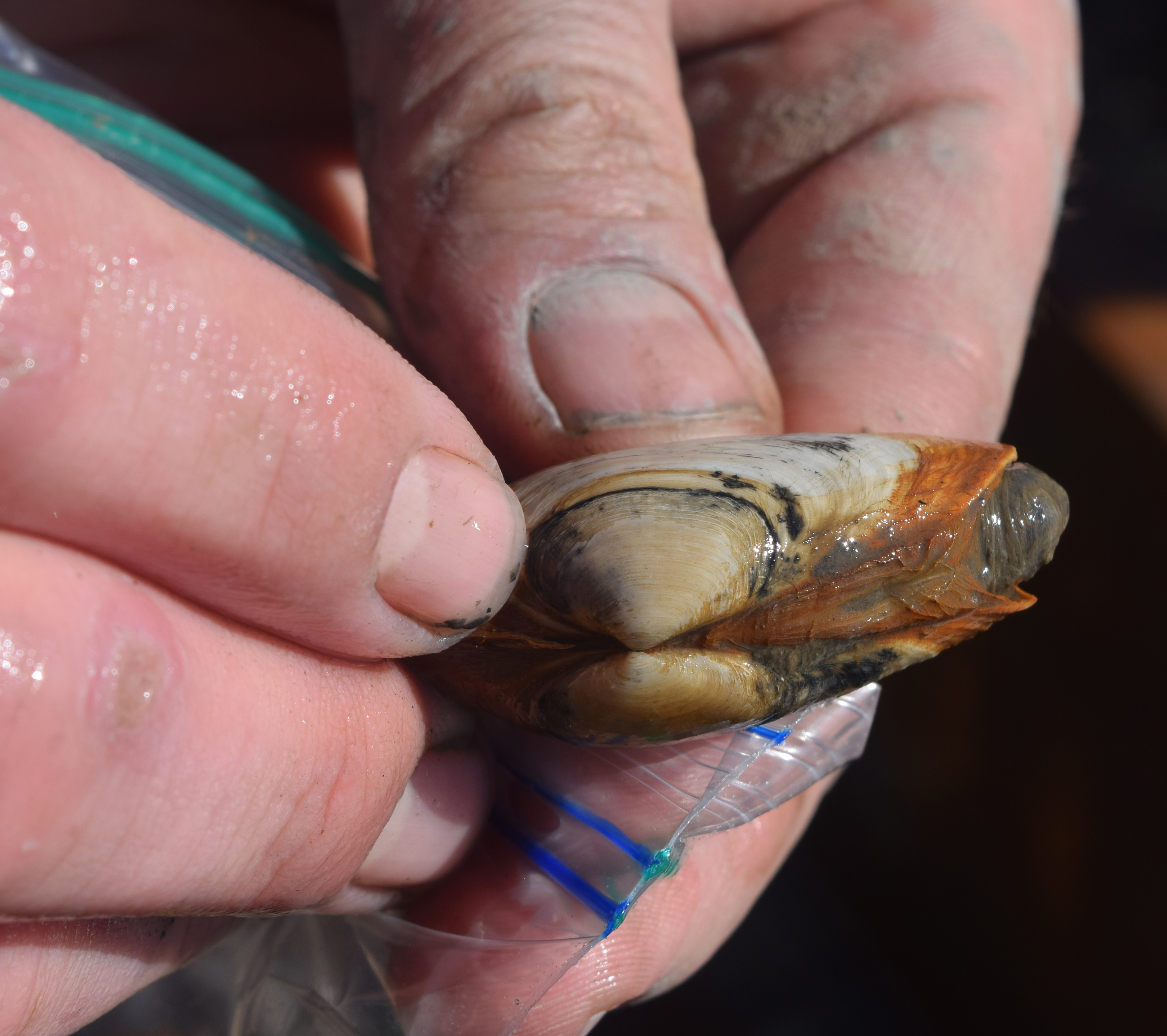 Above is a picture of a hatchery clam from one of the pots. Notice the change in the coloration of the shell at the tip of Kyle’s finger. That line, called the “hatchery mark,” appears on all hatchery clams that survive and grow after being placed in the mud. It occurs naturally as a result of the change from the hatchery conditions to the conditions on clam flats. It does not occur on wild clams, which makes it easy to distinguish clams that were seeded from those that settled naturally. It also provides a way to see how much the hatchery clams grew. As you can see, this one grew a lot.