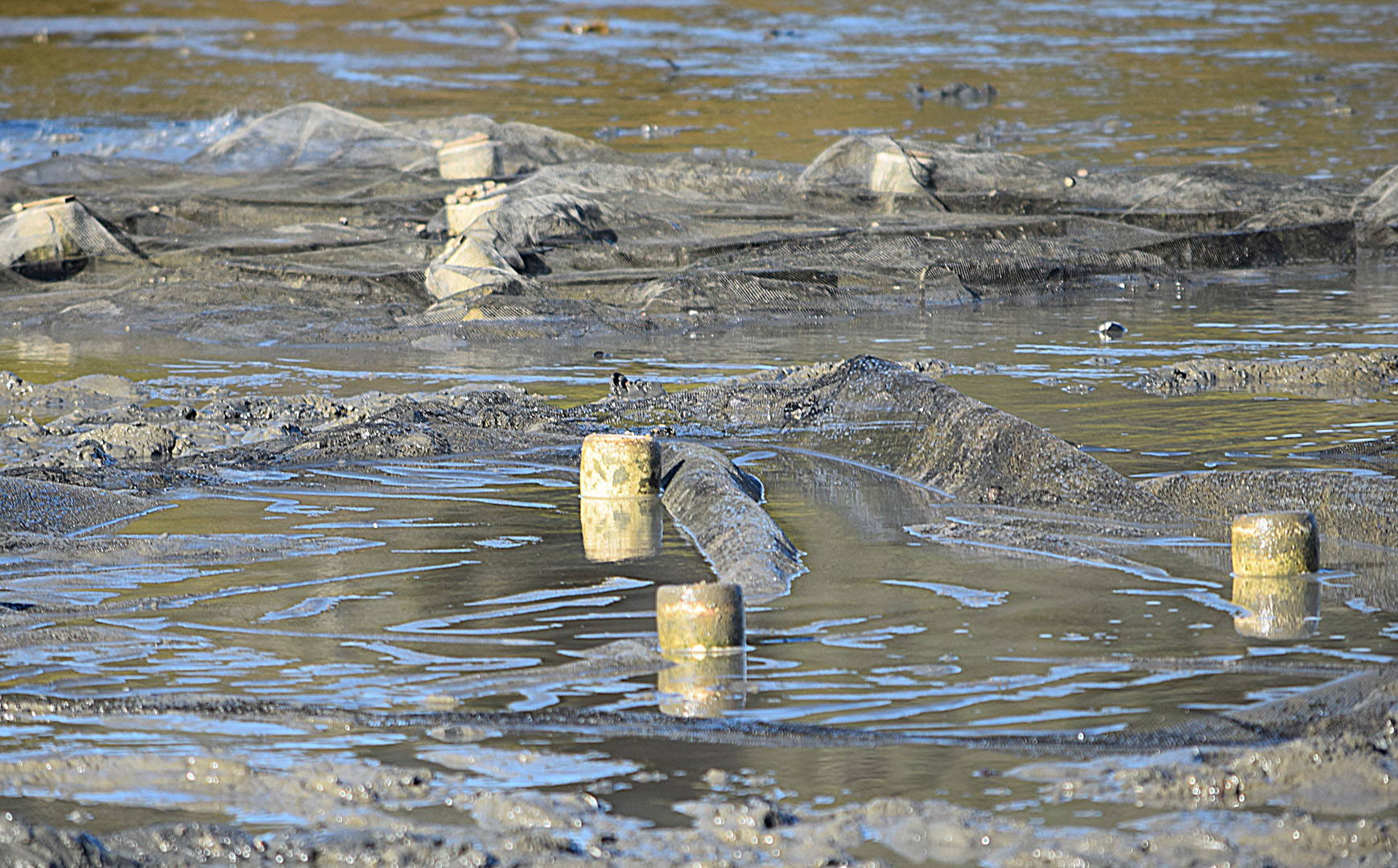 A little background about soft-shell clam reproduction and development might help in understanding the thinking behind this experiment. In eastern Maine, male and female soft-shell clams release sperm and eggs into the ocean once a year. Timing varies with water temperature, but sperm and eggs are typically in the water column from June through August. Fertilization takes place as eggs and sperm float in the ocean. The resulting larvae begin to develop an early form of a shell in a day or two. At that point, they are called “veliger larvae.” Veligers feed on phytoplankton and can swim, but are also moved around by ocean currents, wind, and waves. There can be a lot of veligers, which is why they are an important food source for fish: a Fish and Wildlife Service study reported densities of more than 1,000 veliger larvae per cubic meter in samples collected off the coast of Maine. The clams stay in this larval form for a few weeks and can travel a long way from where they started. They grow as they feed and travel, and when they reach a size of about 0.2 mm their shells begin to thicken and they begin to settle out of the water column. They can still move around at this point, and they use that ability to find places with less wave action, good food sources, and mud or sand that they can burrow in. They do not burrow very deeply at this stage, and so can still be subject to wave action that moves them to other places.