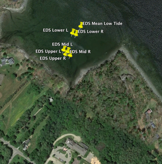 Here’s another thing that impressed me about these students. One boy quickly grabbed a pot and trowel and began digging a hole across from the pot I had placed. That’s not usual. Also not unusual was that, once he had spread soft mud over the top of the pot as I had demonstrated, he found himself kneeling in the mud, with muddy hands, and without clams, a net, or a rubber band to fasten the net — but surrounded by onlookers. I suggested to the others that they should divide into teams with someone doing the digging and with others doing the running to make sure that the person in the mud had what he or she needed. The unusual thing was that these students instantly got this and knew how to do it. Without further instruction from adults, they organized themselves, dividing up and sometimes trading off responsibilities. Like walking through the woods and learning outside, working in teams was clearly something that these students had done before and knew how to do. They quickly had all the experimental units placed along the first, highest transect and were ready to move further down the mudflat to a second transect. The students took a lunch break and, when they came back at 12:30, the tide was fully out. On that day the low tide was actually expected to be at the mean low tide level, enabling us to take a GPS reading that positioned the average low tide for that cove. As we finished putting in the experimental units at the final, lowest transect, some students took the opportunity to explore the large new world revealed by the receded ocean, others continued to be engaged, heads down, in wrapping up the work. Below is a screenshot from Google Earth that shows the ends of each of our three transects, along with our estimate of the mean low tide location. The school building is toward the bottom of the picture.