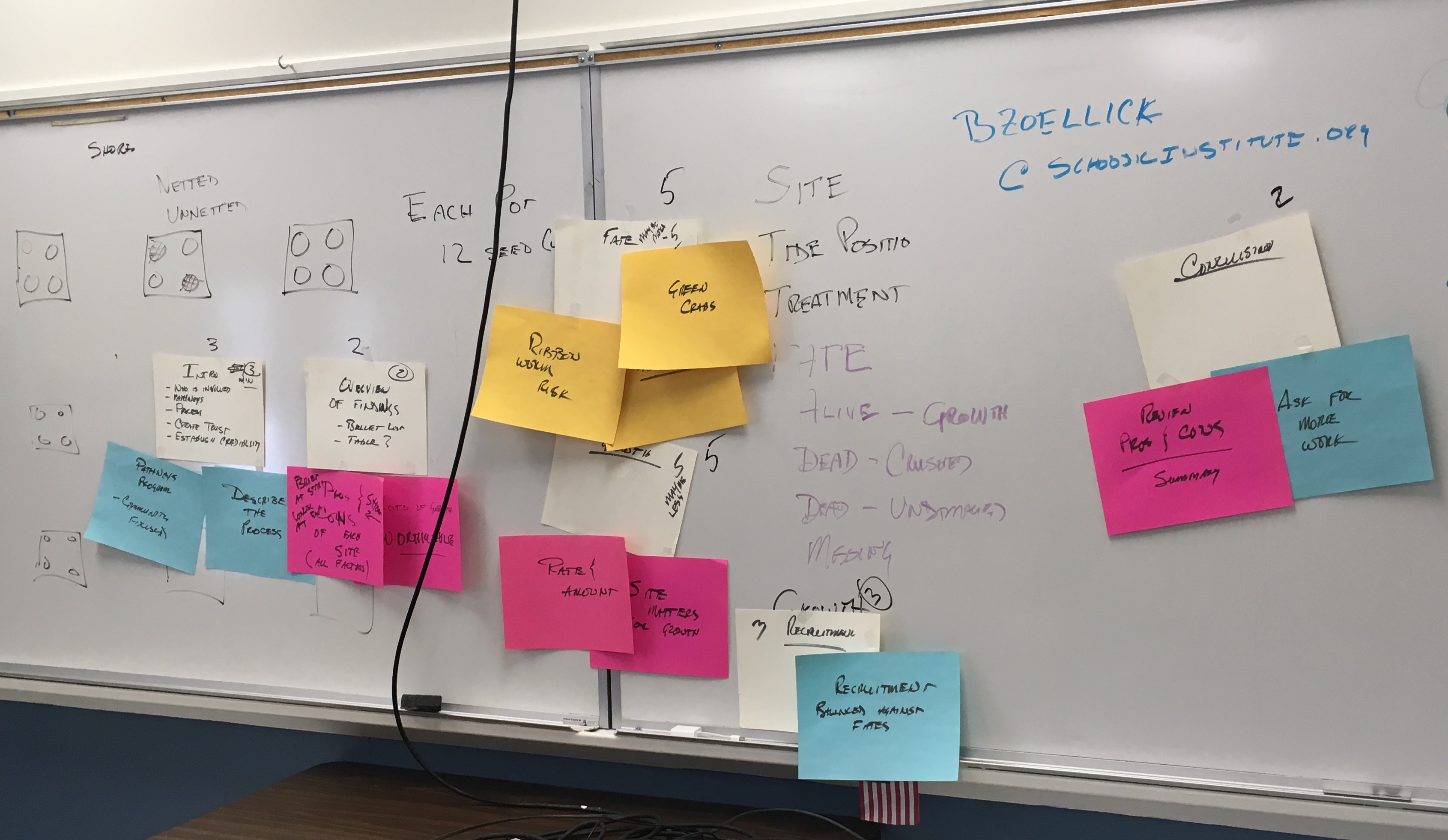 Creating a “storyboard” is a great way to make thinking visible when students are working together to create a presentation. When we worked with Pathways students last year to help them present their findings from clam growth and predation experiments in the summer of 2018, we created a storyboard by taping ideas to a whiteboard in the front of the classroom, moving parts of the presentation around as their thinking changed.